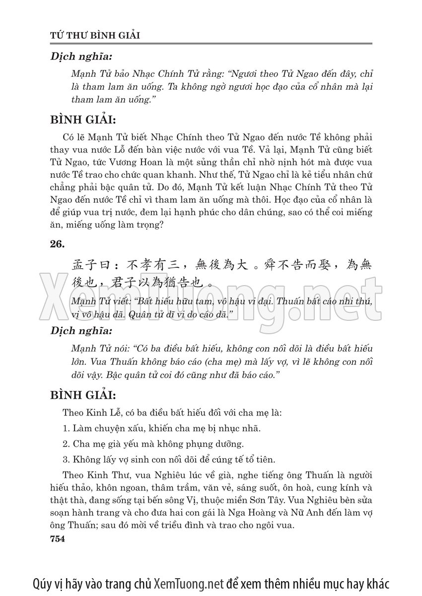 Sách "Tứ thư bình giải" của tác giả Lý Minh Tuấn nhằm cho chúng ta thấy được toàn bộ quá trình phát triển và trải qua thăng trầm của bộ tứ thư. Bộ sách này của Nho giáo ra đời cách nay khoảng hơn 2.000 năm, đã trải qua bao sóng gió theo những giai đoạn thăng trầm của lịch sử Trung Hoa. Lần thì bị Tần Thủy Hoàng đốt, lần thì bị tiêu tan trong các cuộc nội chiến triền miên của Trung Hoa. Do vậy khó tránh được nạn "tam sao thất bản". Đến đời nhà Tống, bộ sách này mới được các danh Nho tu chỉnh.