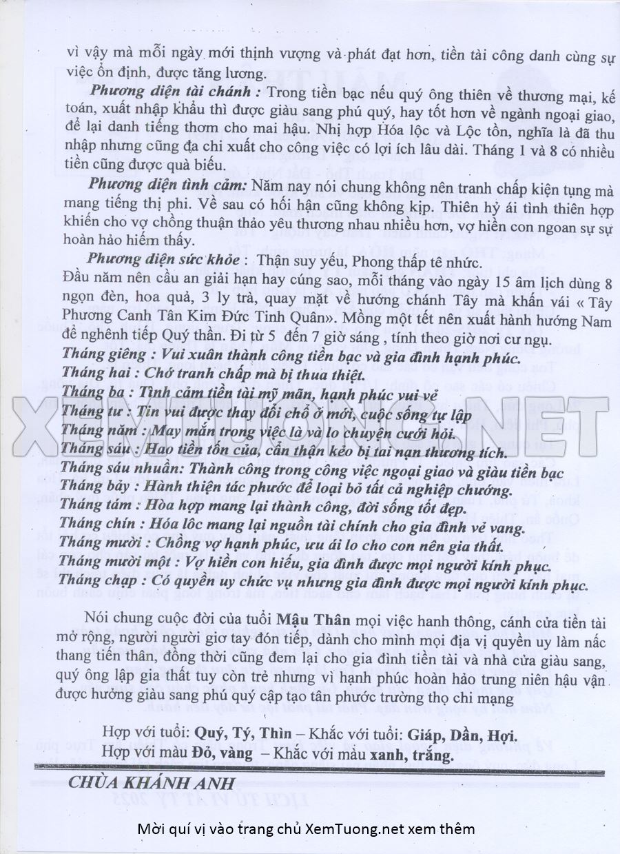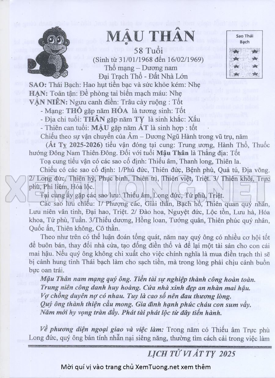 Tử Vi Năm Ất Tỵ 2025 mạng nam MẬU THÂN