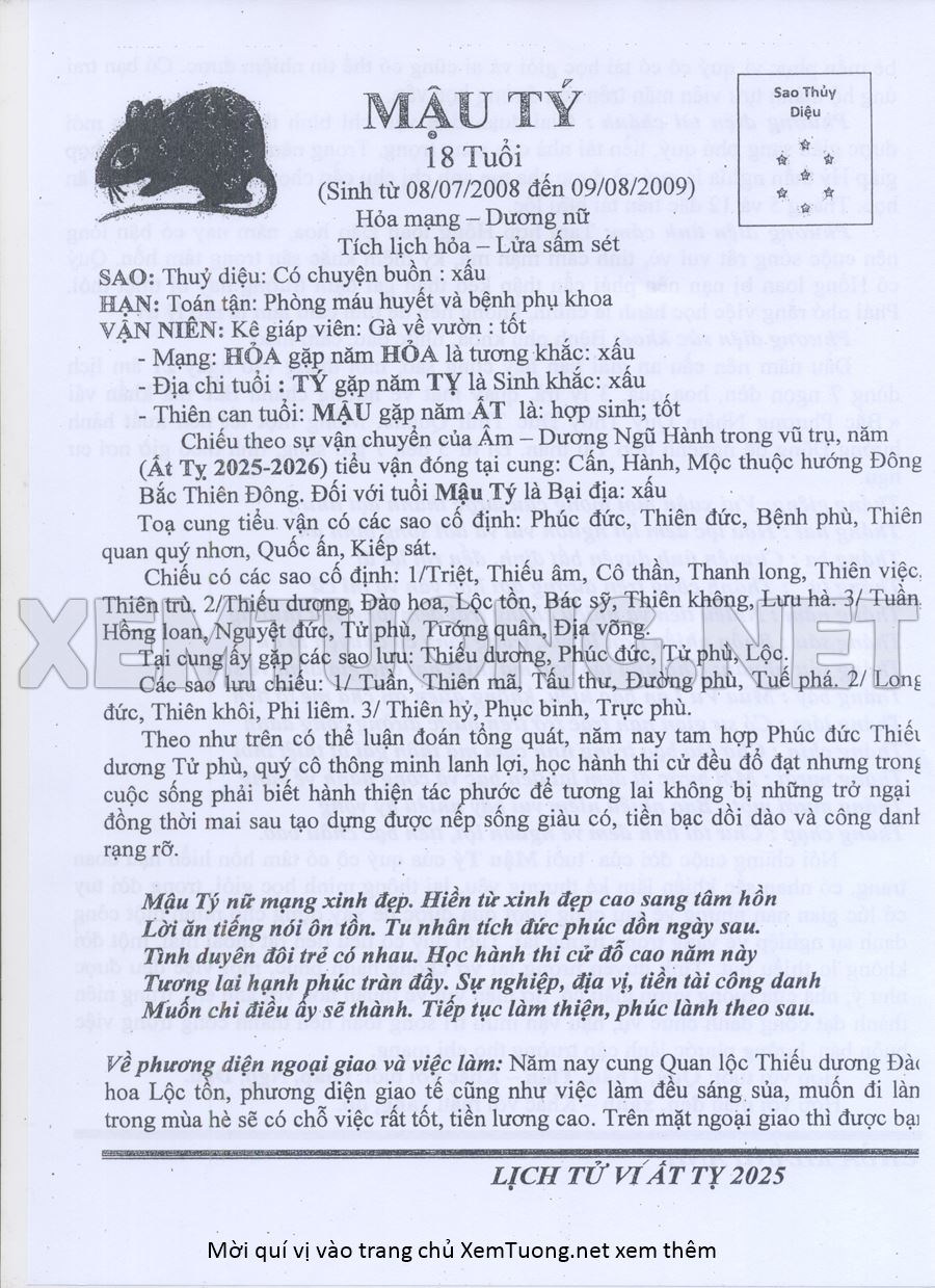 Tử Vi Năm Ất Tỵ 2025 mạng nữ MẬU TÝ