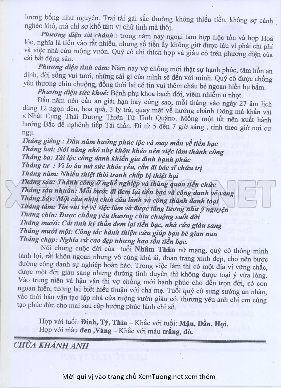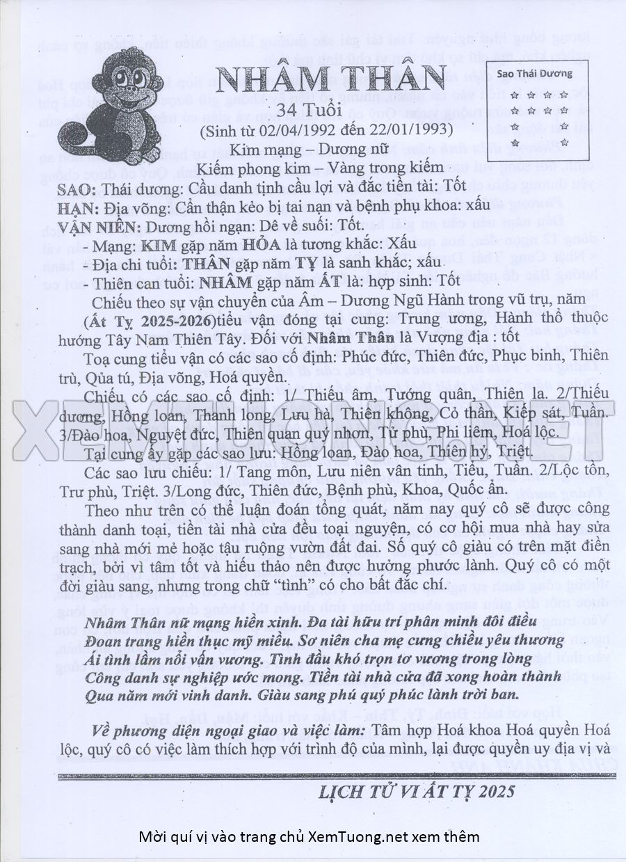 Tử Vi Năm Ất Tỵ 2025 mạng nữ NHÂM THÂN