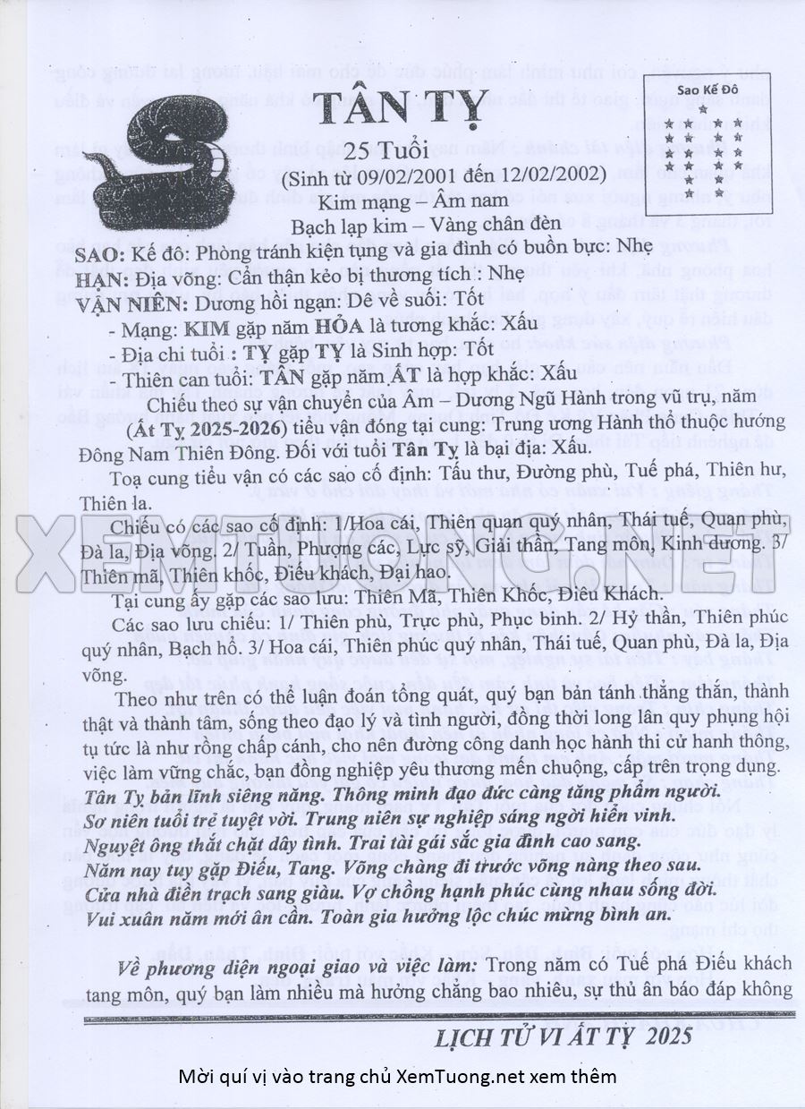 XEM SAO HẠN, TAM TAI, KIM LÂU, HOANG ỐC NĂM ẤT TỴ 2025