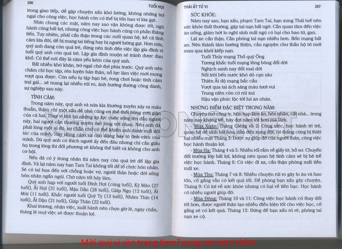 (Lưu ý: Thái Ất Tử Vi được chúng tôi scan từ sách, do đó mỗi tuổi sẽ có nhiều trang, quý vị xem xong hãy nhấn vào trang tiếp theo để xem hết phần tuổi muốn xem. Nếu quý vị xem bằng điện thoại thì hãy kéo qua lại để xem phần bị khuất.)