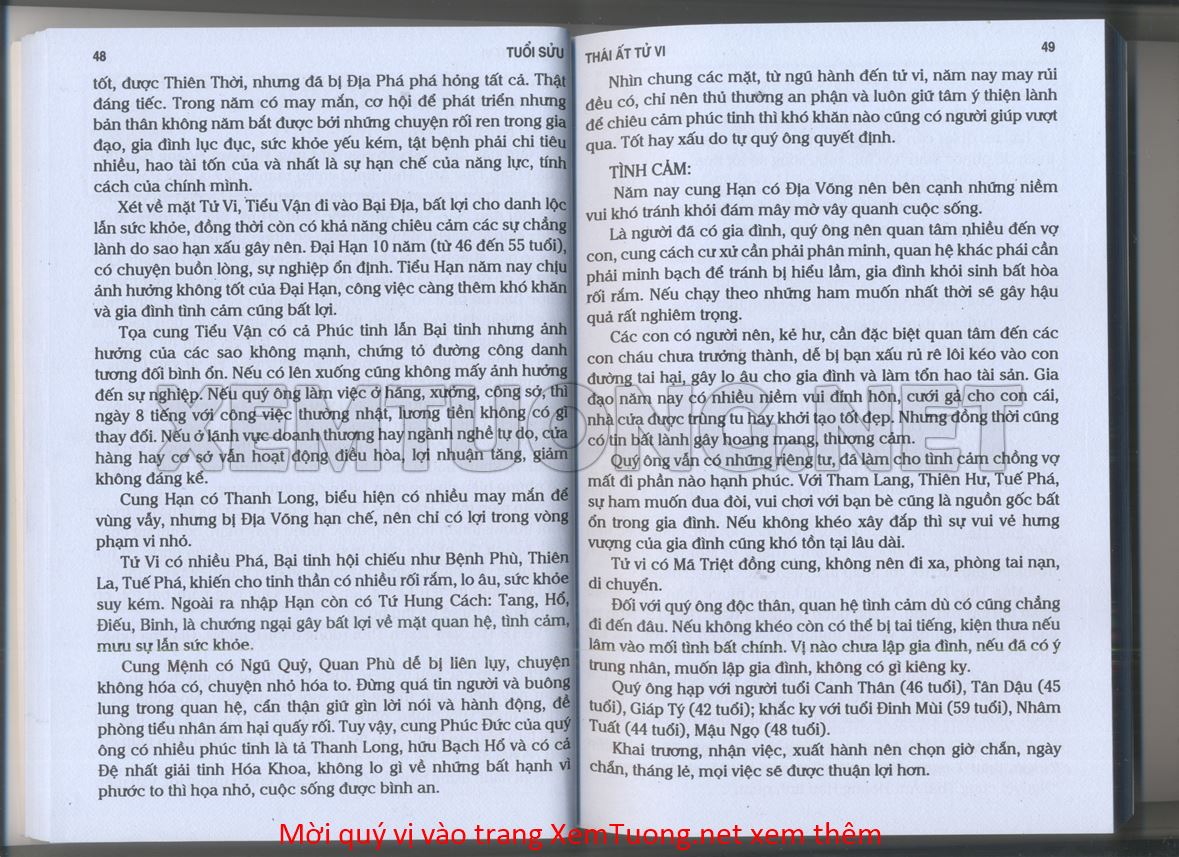 (Lưu ý: Thái Ất Tử Vi được chúng tôi scan từ sách, do đó mỗi tuổi sẽ có nhiều trang, quý vị xem xong hãy nhấn vào trang tiếp theo để xem hết phần tuổi muốn xem. Nếu quý vị xem bằng điện thoại thì hãy kéo qua lại để xem phần bị khuất.)