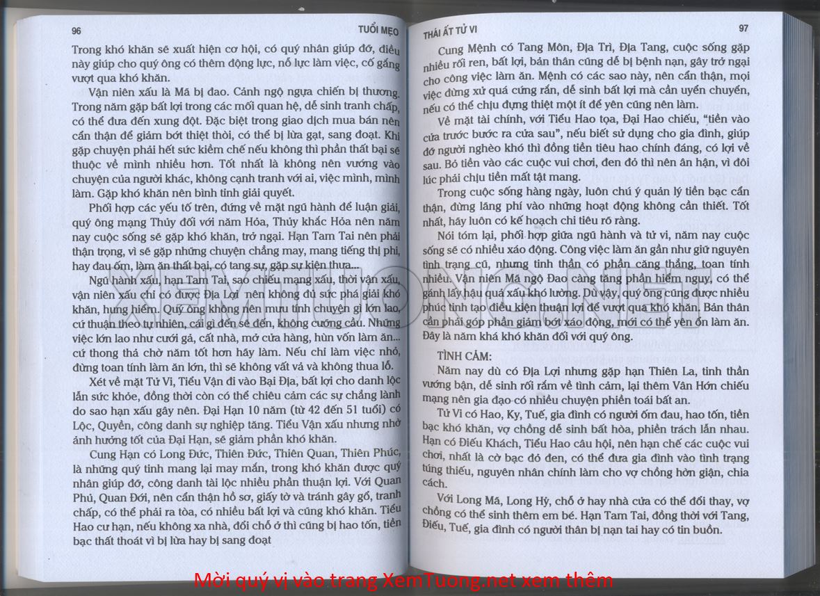 (Lưu ý: Thái Ất Tử Vi được chúng tôi scan từ sách, do đó mỗi tuổi sẽ có nhiều trang, quý vị xem xong hãy nhấn vào trang tiếp theo để xem hết phần tuổi muốn xem. Nếu quý vị xem bằng điện thoại thì hãy kéo qua lại để xem phần bị khuất.)