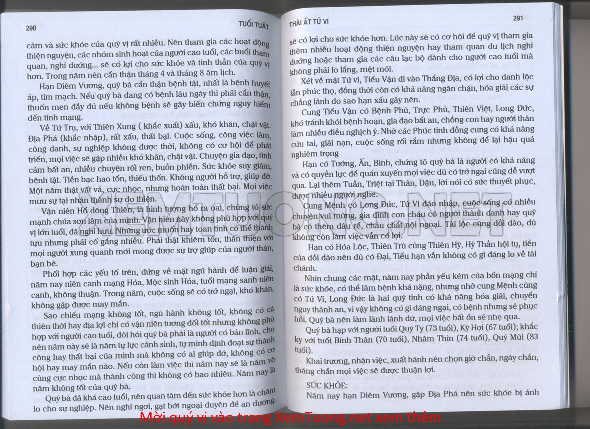 (Lưu ý: Thái Ất Tử Vi được chúng tôi scan từ sách, do đó mỗi tuổi sẽ có nhiều trang, quý vị xem xong hãy nhấn vào trang tiếp theo để xem hết phần tuổi muốn xem. Nếu quý vị xem bằng điện thoại thì hãy kéo qua lại để xem phần bị khuất.)