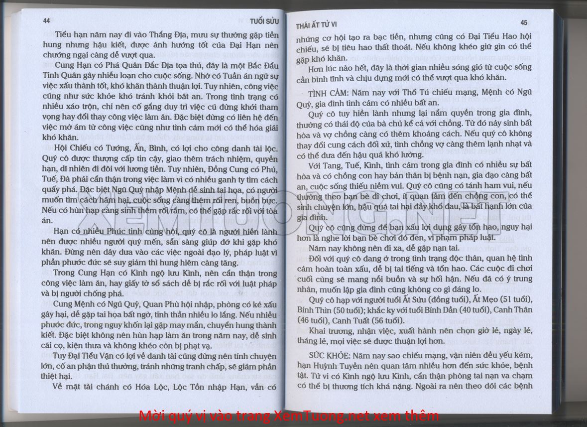 (Lưu ý: Thái Ất Tử Vi được chúng tôi scan từ sách, do đó mỗi tuổi sẽ có nhiều trang, quý vị xem xong hãy nhấn vào trang tiếp theo để xem hết phần tuổi muốn xem. Nếu quý vị xem bằng điện thoại thì hãy kéo qua lại để xem phần bị khuất.)