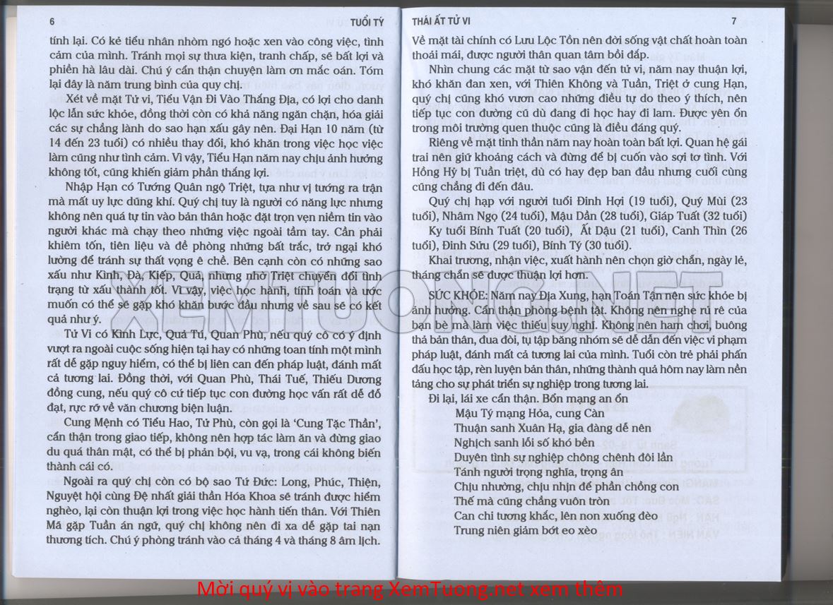 (Lưu ý: Thái Ất Tử Vi được chúng tôi scan từ sách, do đó mỗi tuổi sẽ có nhiều trang, quý vị xem xong hãy nhấn vào trang tiếp theo để xem hết phần tuổi muốn xem. Nếu quý vị xem bằng điện thoại thì hãy kéo qua lại để xem phần bị khuất.)
