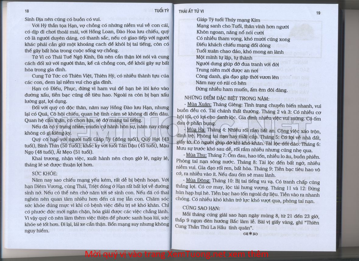 (Lưu ý: Thái Ất Tử Vi được chúng tôi scan từ sách, do đó mỗi tuổi sẽ có nhiều trang, quý vị xem xong hãy nhấn vào trang tiếp theo để xem hết phần tuổi muốn xem. Nếu quý vị xem bằng điện thoại thì hãy kéo qua lại để xem phần bị khuất.)
