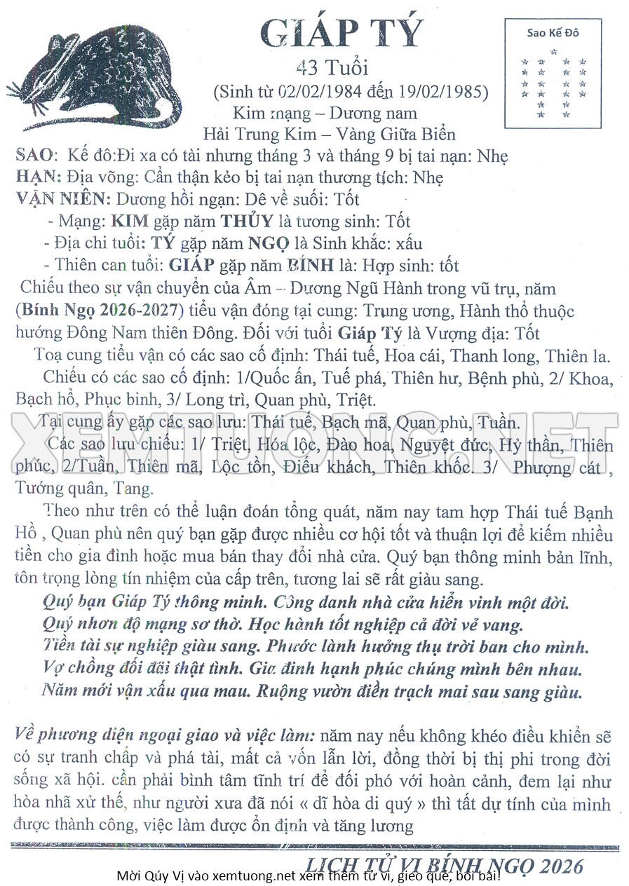 Tử Vi Năm Bính Ngọ 2026 mạng nam GIÁP TÝ