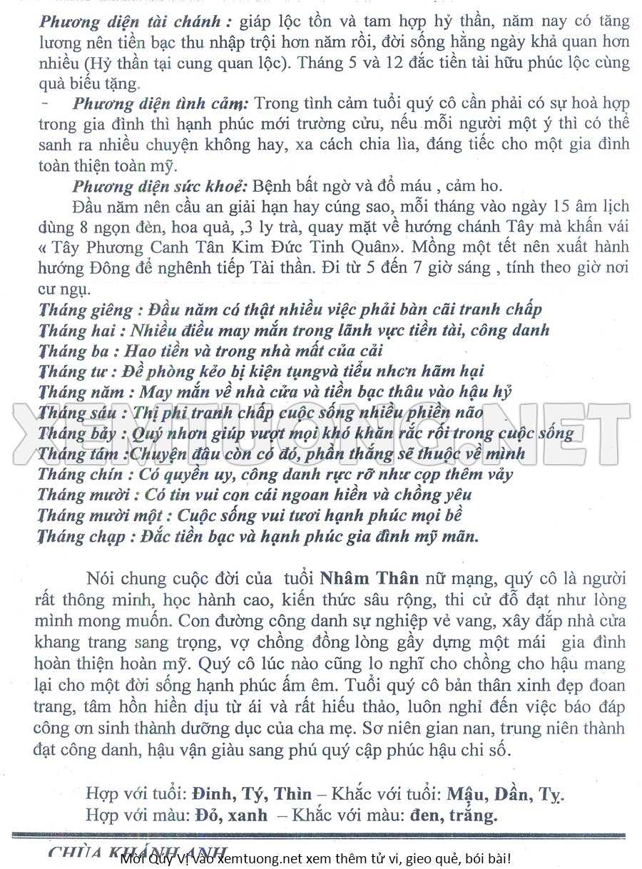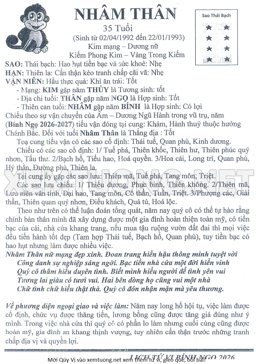 Tử Vi Năm Bính Ngọ 2026 mạng nữ NHÂM THÂN