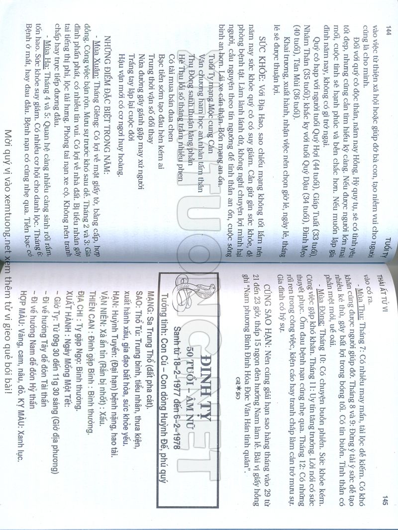 (Lưu ý: Thái Ất Tử Vi được chúng tôi scan từ sách, do đó mỗi tuổi sẽ có nhiều trang, quý vị xem xong hãy nhấn vào trang tiếp theo để xem hết phần tuổi muốn xem. Nếu quý vị xem bằng điện thoại thì hãy kéo qua lại để xem phần bị khuất.)